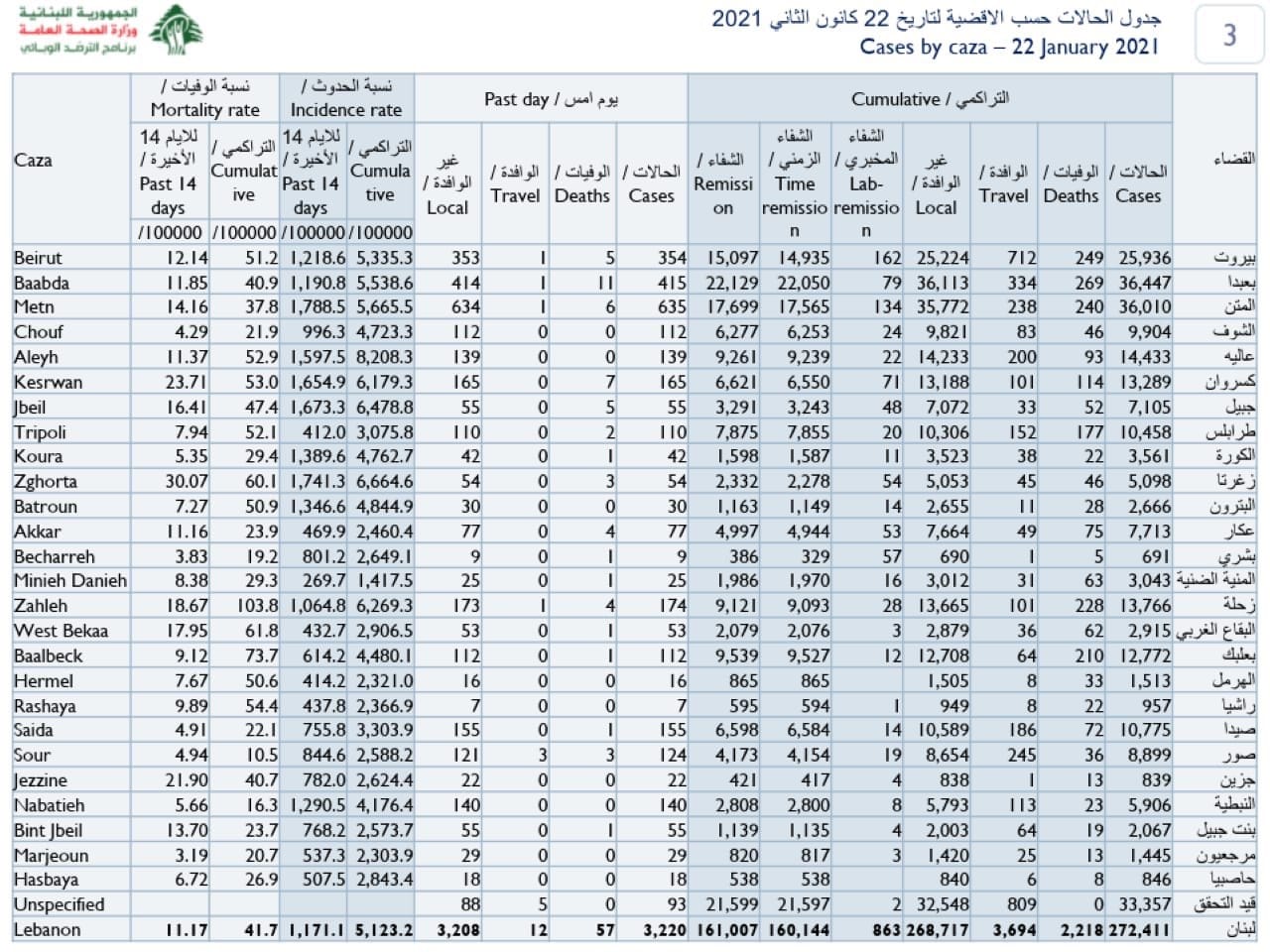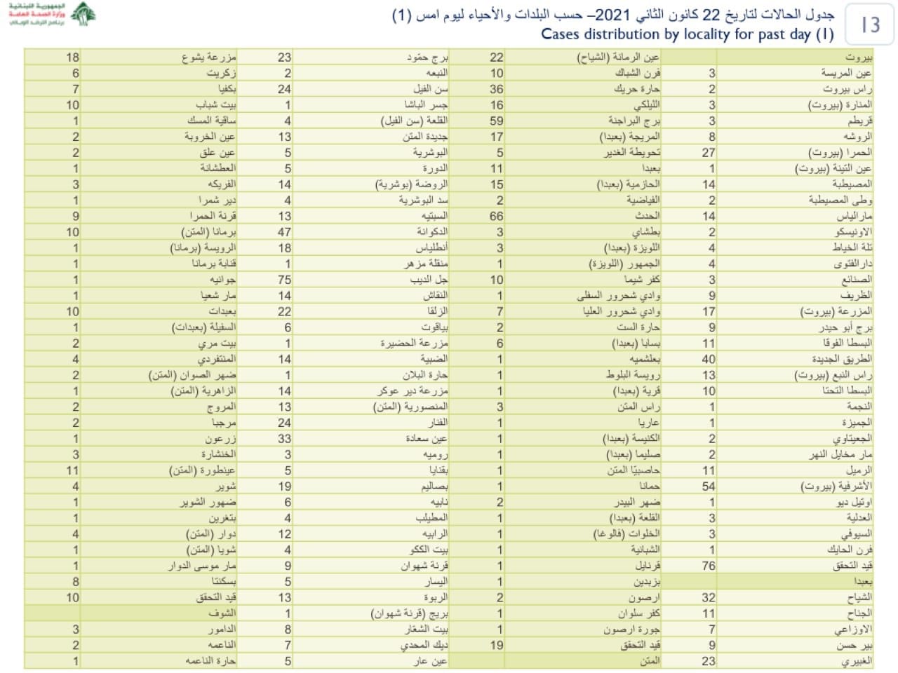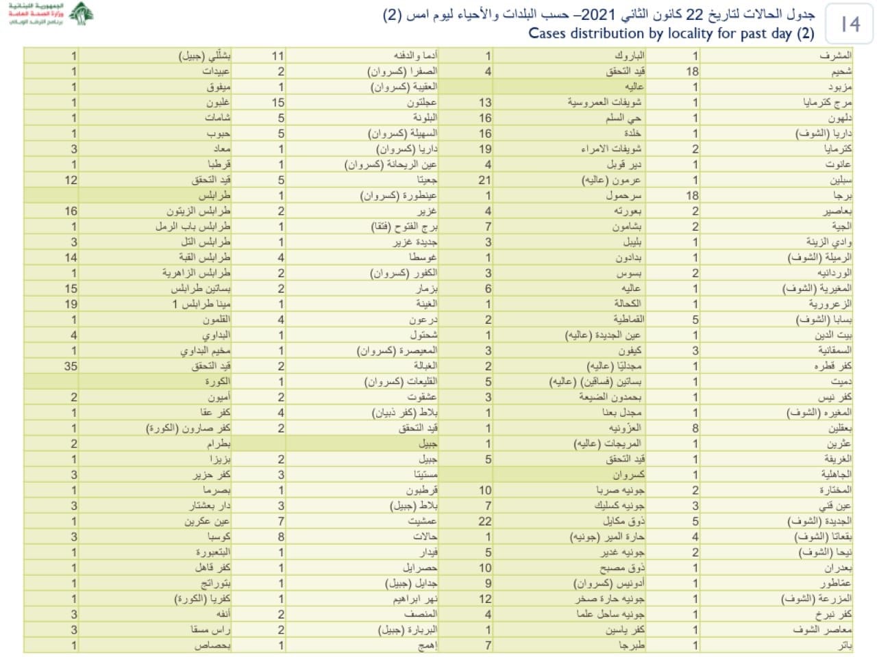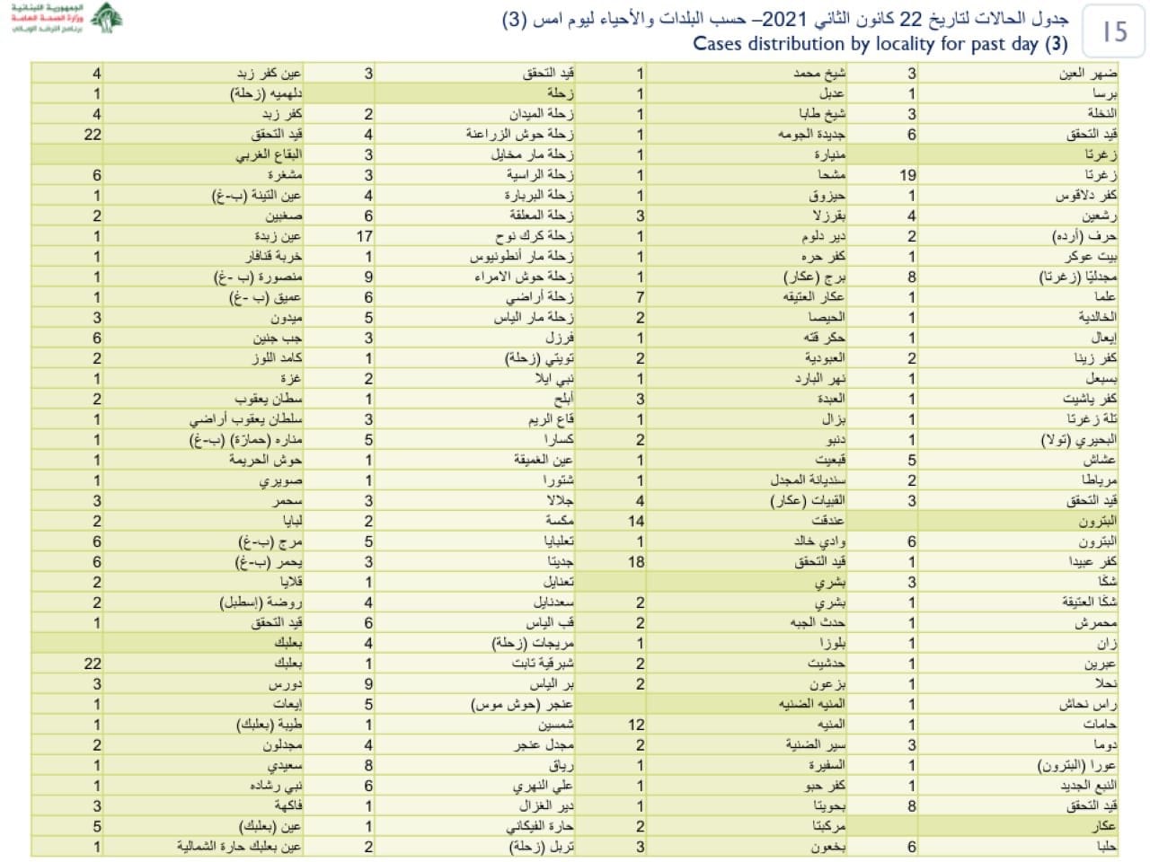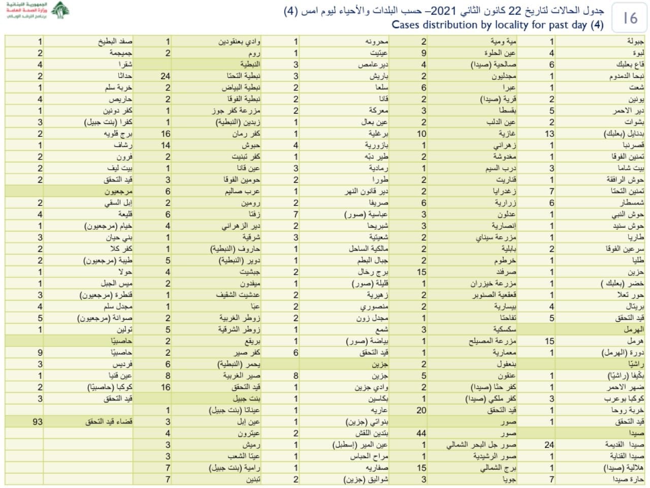 نشرت وزارة الصحة العامّة اليوم الجمعة، جدولاً بيّنت فيه كيف توزّعت الإصابات الجديدة بفيروس كورونا على الأقضية والبلدات اللبنانية.
