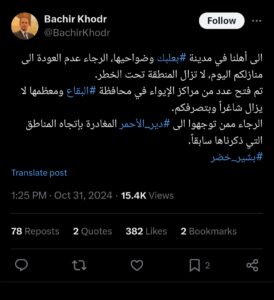 كتب محافظ بعلبك – الهرمل بشير خضر، عبر حسابه على منصة “اكس”: “الى أهلنا في مدينة بعلبك وضواحيها، الرجاء عدم العودة الى منازلكم اليوم، لا تزال المنطقة تحت الخطر. تم فتح عدد من مراكز الإيواء في محافظة البقاع ومعظمها لا يزال شاغراً وبتصرفكم. الرجاء ممن توجهوا الى دير الأحمر المغادرة بإتجاه المناطق التي ذكرناها سابقاً”.
