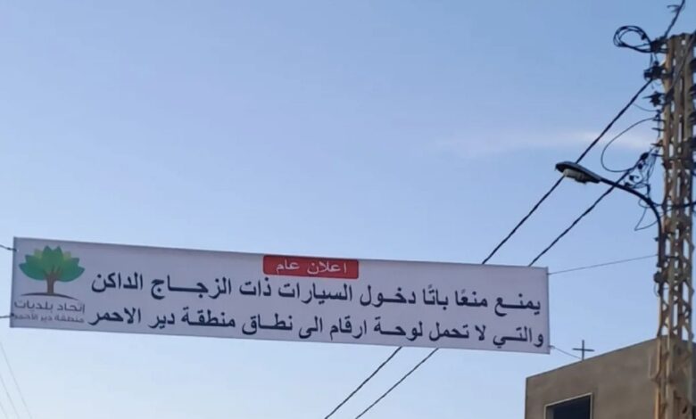 في إطار الإجراءات الاحترازية الرامية لحماية المواطنين في بلدة دير الأحمر والجوار في محافظة بعلبك الهرمل، إضافة إلى النازحين إليها، اتخذ اتحاد بلديات دير الأحمر سلسلة قرارات، من بينها منع دخول السيارات ذات الزجاج الداكن والتي لا تحمل أرقاماً إلى البلدة.ورُفعت لافتات على مداخل دير الأحمر تشدّد على التقيّد بهذه الإجراءات، خشية من أي تصرفات قد تعكّر هدوء تلك المناطق.
