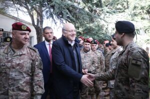 قال رئيس حكومة تصريف الأعمال نجيب ميقاتي من ثكنة الجيش في مرجعيون، المحطة الاولى في جولته الجنوبية: “لا بد بداية من توجيه التحية لارواح شهداء الجيش الذين سقطوا دفاعا عن الارض، واتطلع في وجوهكم واشعر بالفخر لانني اشعر بمعنوياتكم العالية واصراركم على الدفاع عن الارض رغم كل الصعوبات”.