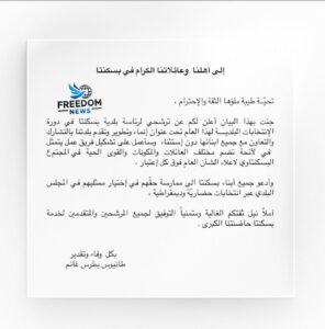 وفي ختام بيانه، أعرب عن أمله في نيل ثقة أبناء بسكنتا، متمنيًا التوفيق لجميع المرشحين في خدمة البلدة.