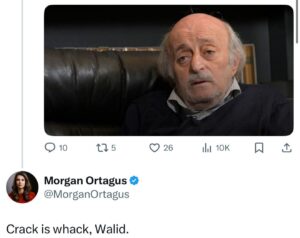 علقت نائبة المبعوث الأميركي الى الشرق الأوسط مورغان أورتاغوس، عبر حسابها على منصة “إكس” على نص مقابلة لرئيس الحزب التقدمي السابق وليد جنبلاط يقول فيها إن شروطها (أورتاغوس) على لبنان مستحيلة، وكتبت أورتاغوس: “المخدرات مضرة وليد”.