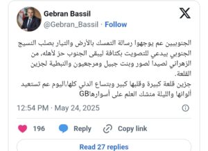كتب رئيس التيار الوطني الحر النائب جبران باسيل عبر حسابه على منصة “أكس”: “الجنوبيين عم يوجهوا رسالة التمسك بالأرض والتيار بصلب النسيج الجنوبي بيدعي للتصويت بكثافة ليبقى الجنوب حرّ لأهله، من الزهراني لصيدا لصور وبنت جبيل ومرجعيون والنبطية لجزين القلعة. جزين قلعة كبيرة وقلبها كبير وبتساع الدني كلها، اليوم عم تستعيد ألوانها والليلة منشك العلم على أسوارها”.