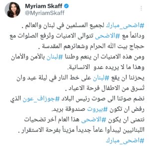 مريام سكاف: لن يكون لبنان صندوقة بريد… ونتمنى أن يحمل الأضحى بشائر الأمان والاستقرار.