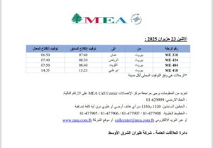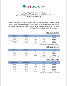 شركة طيران الشرق الأوسط: تقديم مواعيد إقلاع عدد من رحلاتنا المتوجهة من بيروت الى الاردن والخليج العربيّ