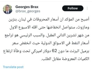 كتب رئيس نقابة أصحاب محطات المحروقات في لبنان، الدكتور جورج بركس، عبر حسابه على منصة X، منشورًا تناول فيه تطوّرات أسعار المحروقات في المرحلة المقبلة، مشيرًا إلى معطيات لافتة تتعلّق باتجاه الأسعار خلال الأسابيع المقبلة.