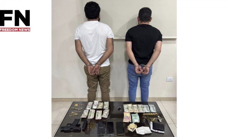 وتابع, بتاريخ 30-10-2025، وبعد رصد ومراقبة دقيقة، تمكّنت إحدى دوريّات الشّعبة من توقيفهما بكمينٍ في محلّة ضهر الوحش، على متن سيّارة نوع نيسان لون كحلي، تم ضبطها. بتفتيشهما والسّيّارة، تم ضبط مسدّس حربي مع ممشط و14 طلقة نارية، وبطاقة ذاكرة USB، ومستندات وأوراق شخصيّة، وسلسال عدد 2، وخاتم عدد 3، “بلاك” عدد 2، وقلادة، وساعة يد، مبلغ مالي، و 3 هواتف خلويّة.