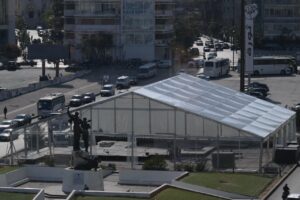 وثّقت عدسة الزميل نبيل اسماعيل نصب الخيمة التي سيلتقي فيها البابا لاوون الرابع عشر رؤساء الطوائف الإسلامية في ساحة الشهداء.