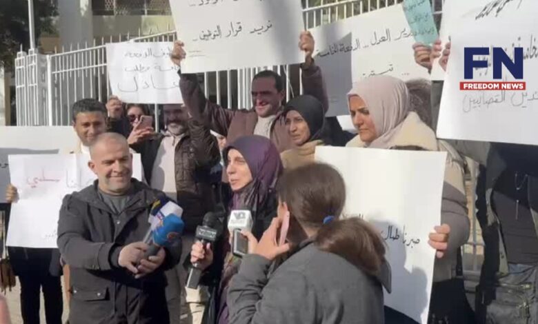 نفّذت لجنة متابعة أوضاع الناجحين في مباراة المساعدين القضائيين وقفة احتجاجية أمام مبنى وزارة العدل، للمطالبة بإقرار تعيينهم في الملاك العام.