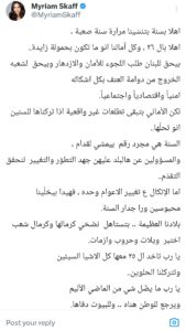 نشرت رئيسة الكتلة الشعبية النائبة ميريام سكاف عبر حسابها الرسمي على منصة × رسالة مع دخول العام الجديد 2026، حملت فيها وجع اللبنانيين وآمالهم بالخروج من سنواتٍ صعبة أثقلت كاهل الوطن والمواطن اليكم الرسالة  .