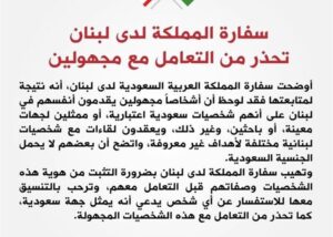 وأهابت السفارة بـ«ضرورة التثبت من هويات تلك الشخصيات وصفاتها قبل التعامل معها»، ورحبت «بالتنسيق معها والاستفسار عن أي شخص يدَّعي أنه يمثل جهة سعودية»، كما حذرت من التعامل مع تلك الشخصيات المجهولة. ويكرر سفير المملكة لدى لبنان وليد بخاري، موقف بلاده الداعم لاستقرار لبنان، وعدم التدخل في شؤونه الداخلية.