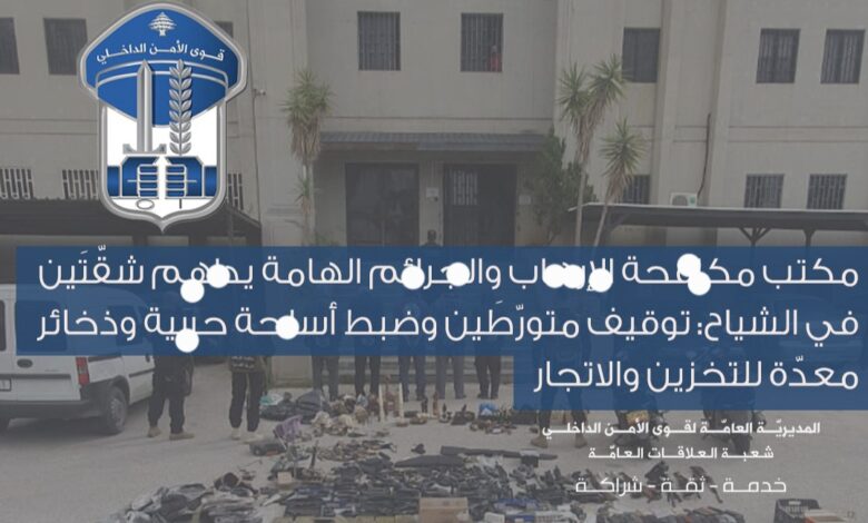 في إطار الجهود المستمرة التي تبذلها قوى الأمن الداخلي لمكافحة الجرائم، لا سيما تلك المتعلقة بالاتجار غير المشروع بالأسلحة الحربية، توافرت معلومات لدى مكتب مكافحة الإرهاب والجرائم الهامة في بيروت وجبل لبنان – وحدة الشرطة القضائية، تفيد بوجود شقتين في محلة الشياح، تعود ملكيتهما لأحد الأشخاص، يتم من خلالهما تخزين الأسلحة الحربية وصيانتها والاتجار بها.
