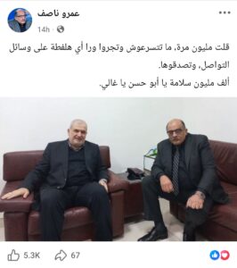 بعد تداول أنباء عبر مواقع التواصل الاجتماعي عن وفاة النائب محمد رعد، سارع الصحافي المصري عمرو ناصف إلى نفي تلك الشائعات، ناشرًا صورة تجمعه برعد عبر حسابه الرسمي على فايسبوك.