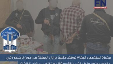توقيف طبيب يزاول المهنة في برالياس زحلة من دون ترخيص وختم عيادته بالشمع الأحمر و ادوية مز.ورة في القاع.